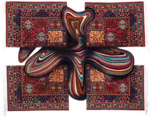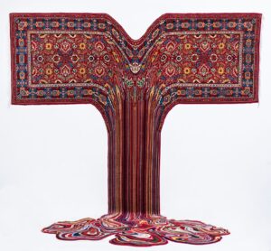 Ahmed’s work captivates the viewer through the unexpected fusion of traditional craftsmanship, rich in cultural and historical memory, with hyper-contemporary and digitally distorted imagery. His carpets appear pixelated, stretched, melted or glitched, as if a digital error were infiltrating the structure of a handmade object. What makes his practice particularly striking is that this tension between traditional process and futuristic design invites viewers to reconsider the boundaries of craft and heritage, proposing tradition as a dynamic, ever-evolving field rather than a fixed cultural artifact.