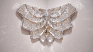 Monir’s mirror-mosaic sculptures and reverse-glass paintings are grounded in the principles of Islamic geometry. Through monumental wall panels and independent sculptural works, she fused meticulous craftsmanship with a modern sensibility, creating compositions that use the interplay of surface texture, light, reflection, color, and form to transformative effect. Countless fragments of mirror and glass are assembled into radiant, interlocking patterns that refract space and animate the viewer’s perception, turning abstraction into a luminous, spatial experience.