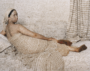 Essaydi’s work often consists of meticulously staged photographs, paintings and installations in which female subjects confront and invert stereotypical representations rooted in Orientalist fantasies. A central motif is her use of Arabic calligraphy written in henna, a practice traditionally associated with women, applied onto bodies, fabrics and domestic spaces to challenge the notion that calligraphy belongs exclusively to men.