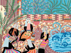 Zughaib’s work often uses bold color, pattern and stylized forms to depict scenes of daily life, family histories and sociopolitical realities of the Middle East. While her compositions can appear playful or decorative at first glance, they frequently carry deeper narratives about war, exile and resilience.