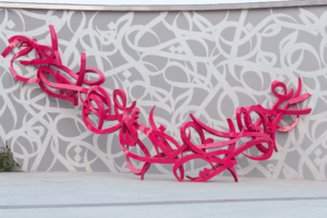 Working in what he calls calligraffiti, eL Seed transforms Arabic letters into dynamic, flowing compositions that merge text and abstraction. His murals often feature poetic verses, philosophical reflections or lines from well-known writers. The intertwined forms, sweeping curves and rhythmic structures invite viewers to experience the emotional and aesthetic power of Arabic script as a universal visual language.