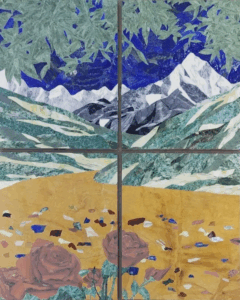 More recently, Abbas has turned to the ancient technique of marble inlay (pietra dura), using marble, semi‑precious stones (especially lapis lazuli), granite, serpentine and other minerals to produce sculptural “gardens,” landscapes and organic motifs that refer to Paradise, nature and spiritual symbolism, as in her large‑scale work Garden (2021).