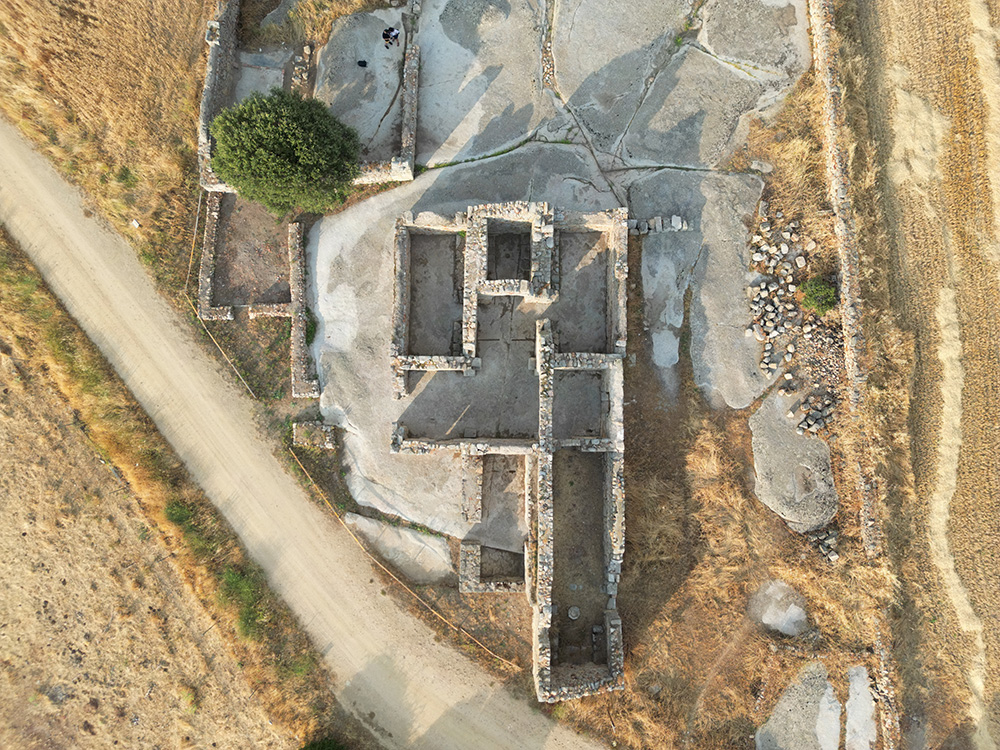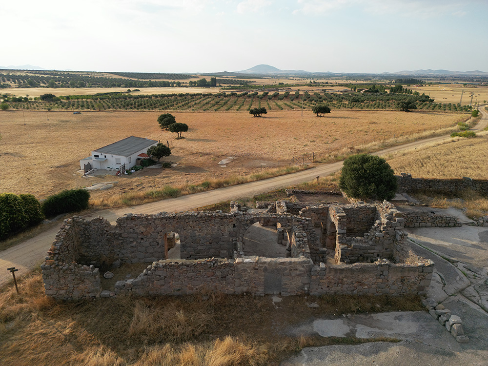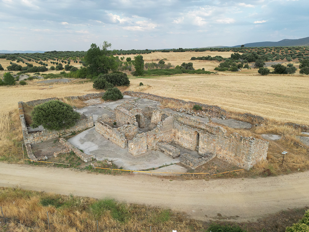 Materiales: granito y fragmentos de mármol reutilizado (spolia). Técnicas: sillería y labra.
