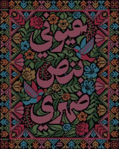 The piece “My Back Has Eyes” is a prime example of this approach—inspired by themes of surveillance and oppression, it reflects not only Israeli occupation in Palestine, drawing inspiration from Palestinian women’s embroidery traditions called tatreez, but stands alongside other pieces which serve as an homage to persecuted communities. “The reason why I ended up doing it as tatreez was because I was mostly inspired by the strength of the Palestinian women where this is very prominent as a discipline.”