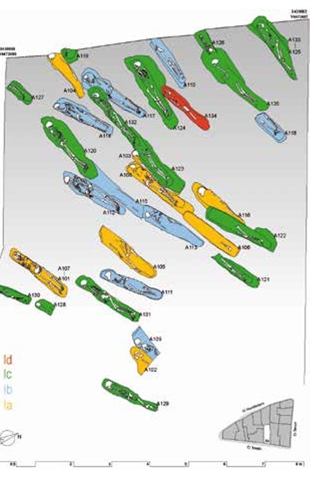Plan of the excavations of the Muslim cemetery at 68 Toledo Street, showing the different burial chronologies: 1A (late 9th-early 10th century); 1B (late 10th-early 12th century); 1C (12th-mid-13th century) and 1D (14th-15th century) © José Ignacio Murillo.