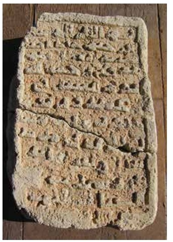 However, in many cases decorated stelae were used, some without inscriptions and others with epigraphic texts, and certain prominent individuals even had qubbas, or mausoleums. The stones from Muslim cemeteries, whether carved or not, were generally looted and reused in the construction of churches and other buildings. This likely occurred in Madrid after Alfonso VI’s conquest, and perhaps the Mudejars, upon converting, sought to prevent it from happening again when they requested the preservation of the ossuary “with its stones”. The only funerary stele known in Madrid—which represents one of only two surviving examples of Arabic epigraphy in the city, the other being a plaster alfiz—was recently rediscovered and studied. The circumstances of its discovery are unknown, though it apparently occurred around two decades ago during the demolition of a building in central Madrid, and for some reason it ended up in private hands, eventually being sold to the Regional Archaeological Museum. It is a rectangular limestone slab, approximately 41 × 26 cm, considerably deteriorated, with a raised inscription in Arabic characters of archaic Kufic style, typical of emiral epigraphy, and traces of red pigment that once highlighted the inscription. The study and translation of the stele were carried out by the Arabist María Antonia Martínez Núñez3, a specialist in Andalusi epigraphy.