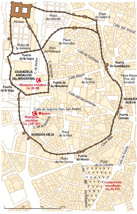 Map of medieval Madrid showing the successive walled enclosures (Muslim and Christian) and the location of the cemetery.