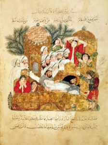 Muslim burial in a qubba, from al-Hariri’s Maqamat, illustrated by Yahya al-Wasiti (1237).