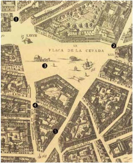 Plaza de la Cebada in Texeira’s map (1656). Marked on it are: the location of the Puerta de Moros (1); the Hospital de la Latina, which acquired part of the Muslim cemetery grounds (2); the current site of the Cebada market, where tombs were discovered in the late 20th century (3); Calle de la Sierpe, which was built over the “Moorish ossuary” (4); and the present-day number 68 of Calle Toledo, where the cemetery was archaeologically documented for the first time (5).